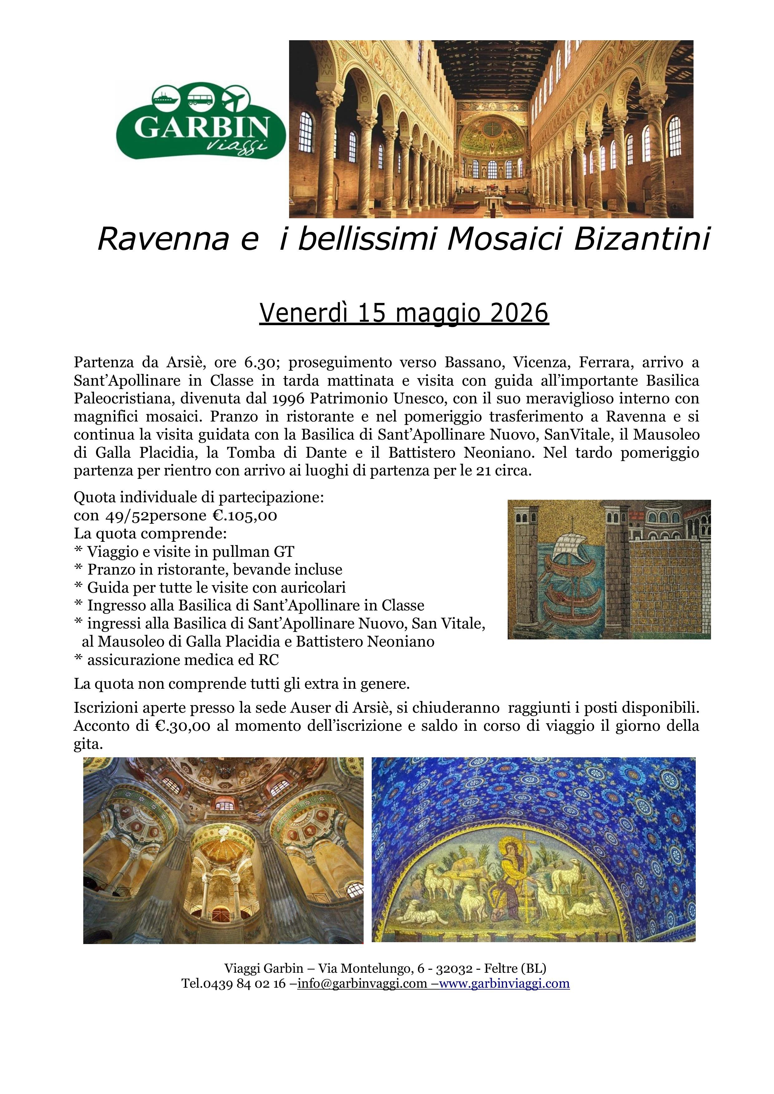 Auser Arsiè propone la gita in oggetto come da volantino allegato. Le iscrizioni sono aperte presso la sede Auser di Arsiè e si chiuderanno raggiunti i posti disponibili. Acconto di €.30,00 al momento dell’iscrizione e ... [Leggi tutto]