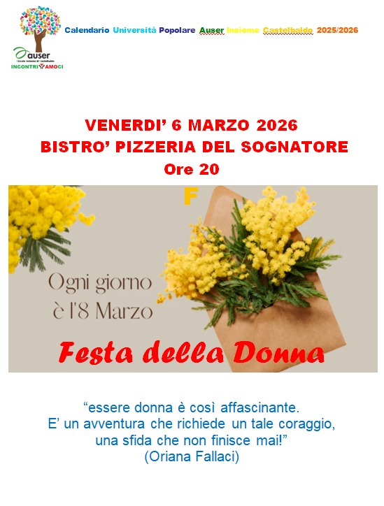 Festa della donna-2026 26 feb 2026, Autore: AUSER CASTELBALDO "INSIEME" ODV - ONLUS Tutti in compagnia a festeggiare la festa delle donne. ... [Leggi tutto]