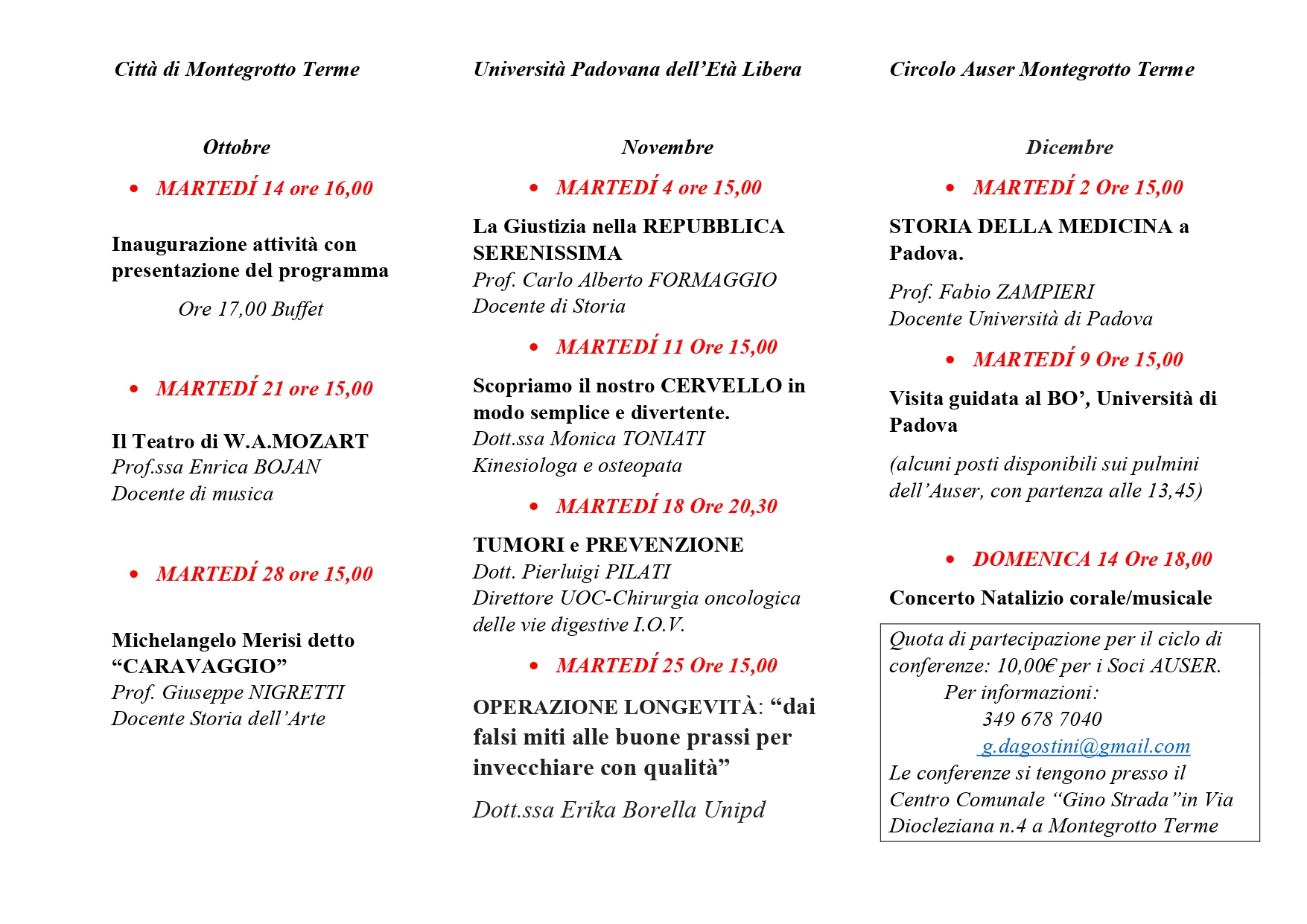 Calendario Conferenze UPEL - autunno 2025 09 ott 2025, Autore: AUSER MONTEGROTTO APS Riprende l'attività delle conferenze UPEL al nostro centro. Il primo incontro sarà martedì 14 ottobre ... [Leggi tutto]