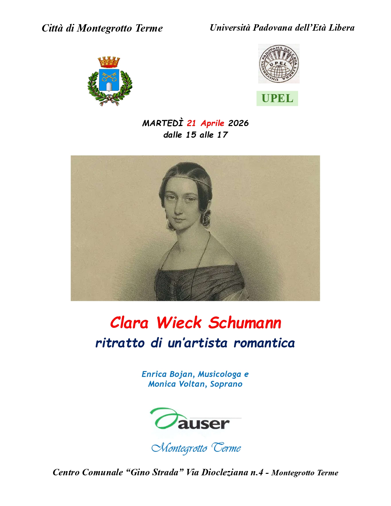 CONFERENZE UPEL Primavera 2026: 21apr2026: Clara Wieck Schumann: ritratto di un’artista romantica