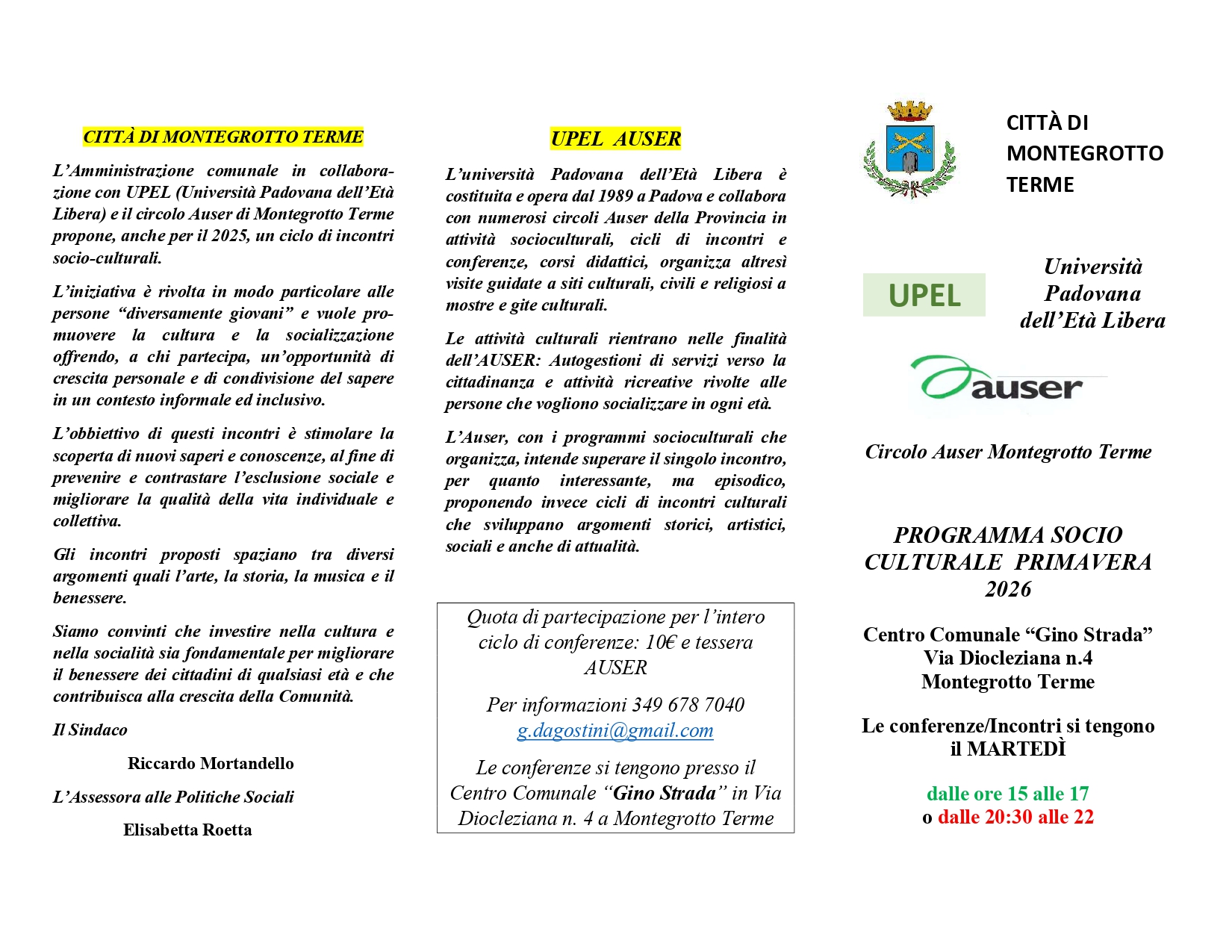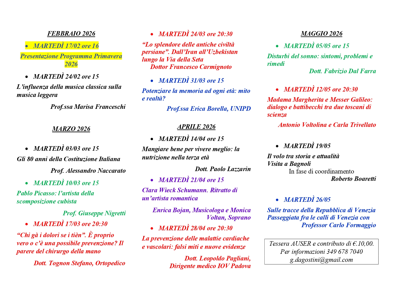 Il primo incontro della sessione primaverile 2026 sarà martedì 17 febbraio: verrà presentato il programma degli incontri programmati fino a fine Maggio 2026.