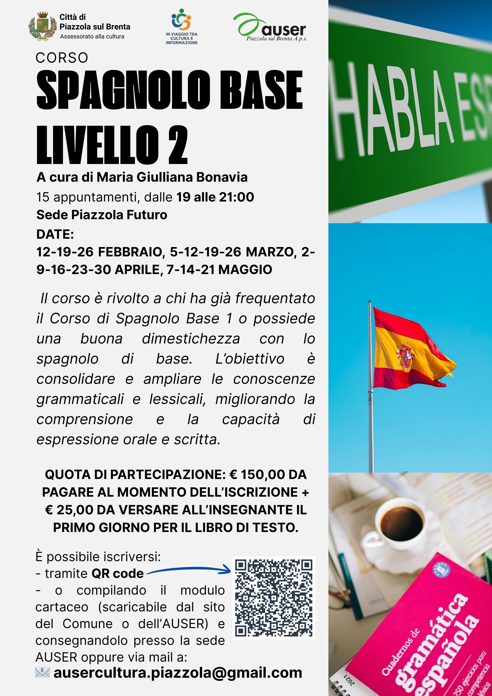 SPAGNOLO BASE LIVELLO 2 30 gen 2026, Autore: AUSER DI PIAZZOLA SUL BRENTA APS Il corso è rivolto a chi ha già frequentato il corso di spagnolo base a livello 1 oppure per chi possiede una buona dimestichezza con lo spagnolo di base Allegati 5.jpg Download label Tag SPAGNOLO BASE LIVELLO 2