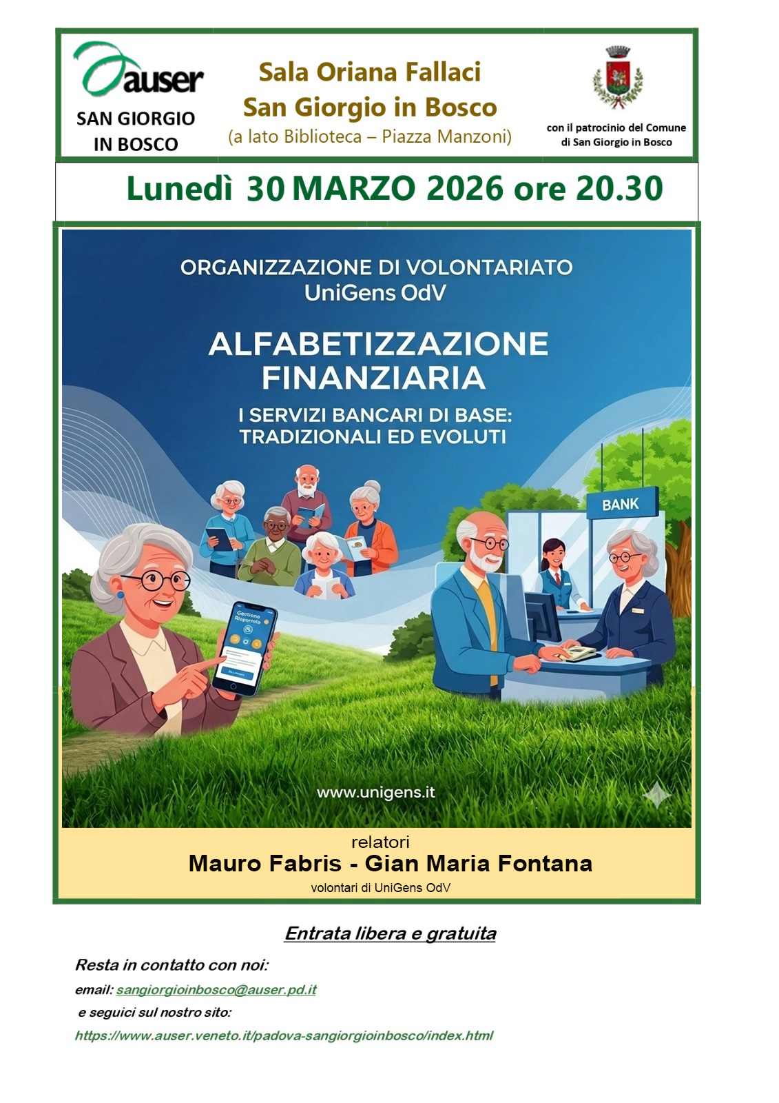 ALFABETIZZAZIONE FINANZIARIA: I SERVIZI BANACARI DI BASE, TRADIZIONALI ED EVOLUTI - A CURA DI MAURO FABRIS E GIAN MARIA FONTANA (UNIGENS) - VENERDI 30 MARZO ORE 20 e 30 - SALA ORIANA FALLACI - SAN GIORGIO IN BOSCO