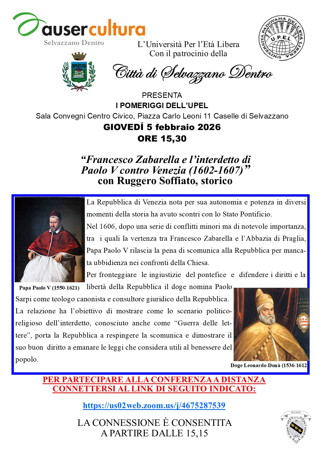 I Giovedì dell'Upel 01 feb 2026, Autore: AUSER DI SELVAZZANO DENTRO APS "Francesco Zabarella e l'interdetto di Paolo V contro Venezia (1602-1607) con Ruggero Soffiato, storico Allegati 2026-02-05.pdf Download