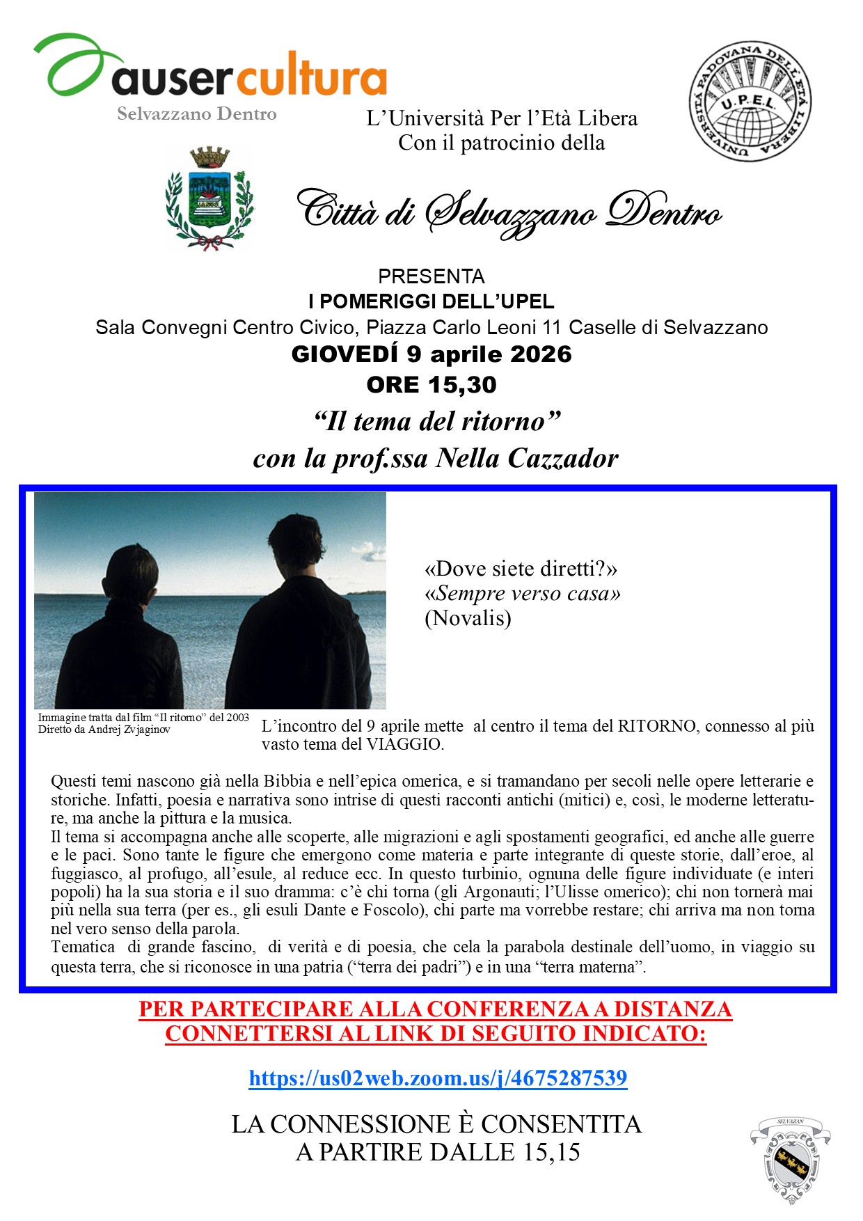 I Giovedì dell'Upel 06 apr 2026, Autore: AUSER DI SELVAZZANO DENTRO APS L'incontro del 9 aprile mette al centro il tema del RITORNO, connesso al più vasto tema del VIAGGO. Allegati 2026--04-09.pdf Download