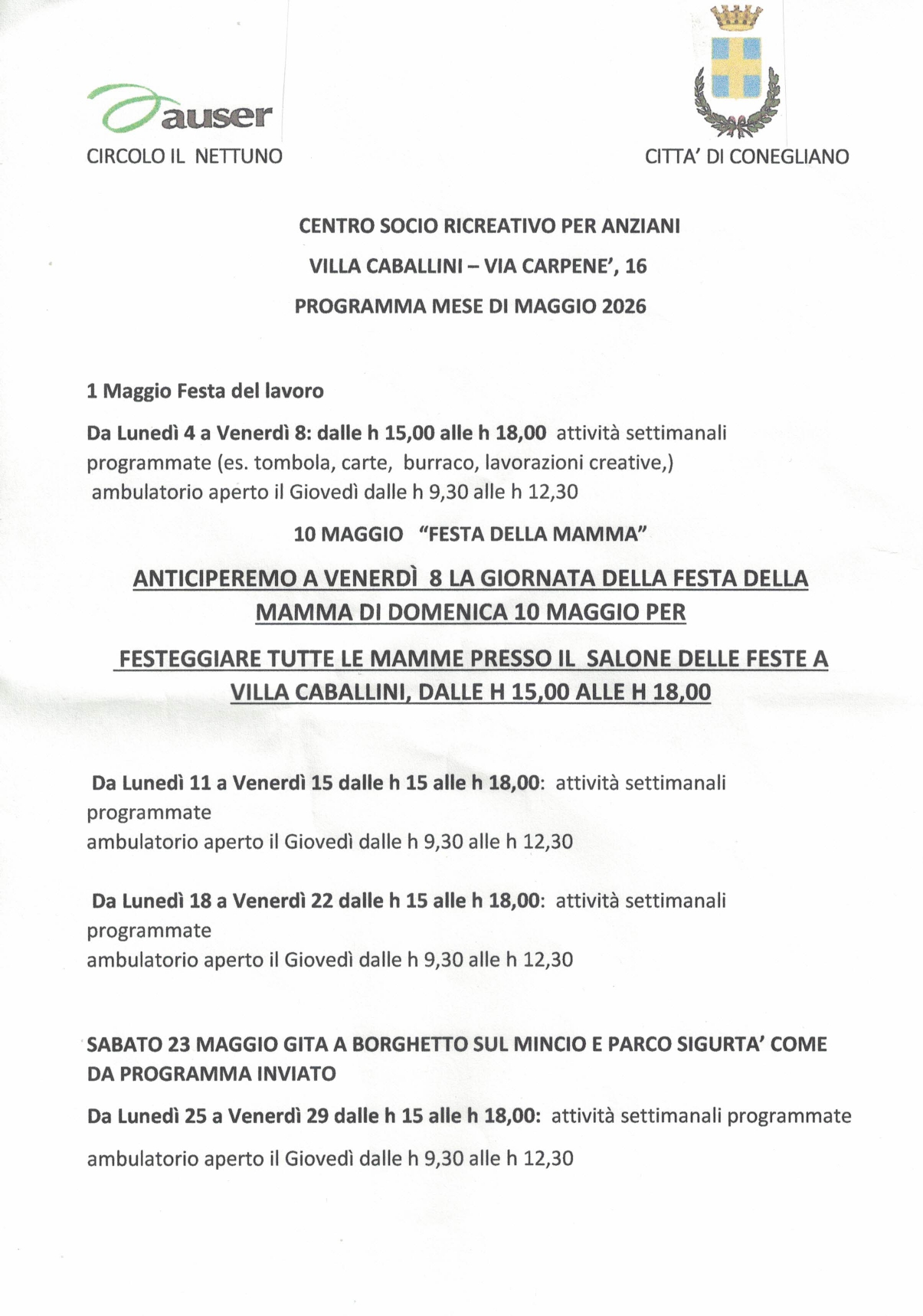 PROGRAMMA MAGGIO 2026 21 apr 2026, Autore: AUSER CIRCOLO RICREATIVO CULTURALE IL NETTUNO ODV-ONLUS PROGRAMMA DI MAGGIO 2026 ... [Leggi tutto]