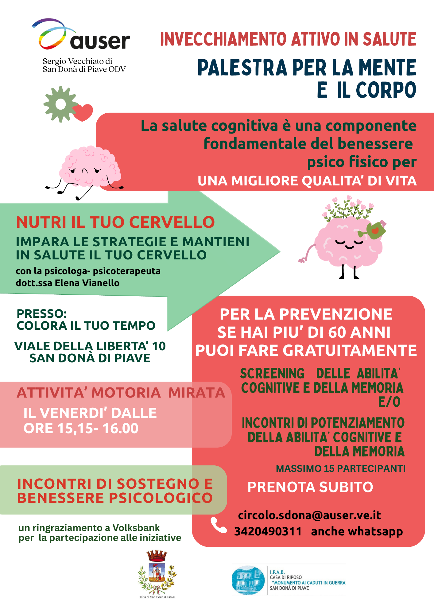 SONO PROPOSTI GRATUITAMENTE SCREENING E POTENZIAMENTO DELLA MEMORIA, ATTIVITA' MOTORIA MIRATA E INCONTRI DI SOSTEGNO PSICOLOGICO PER LE PERSONE CHE SOFFRONO LA DEMENZA E PER I LORO FAMIGLIARI