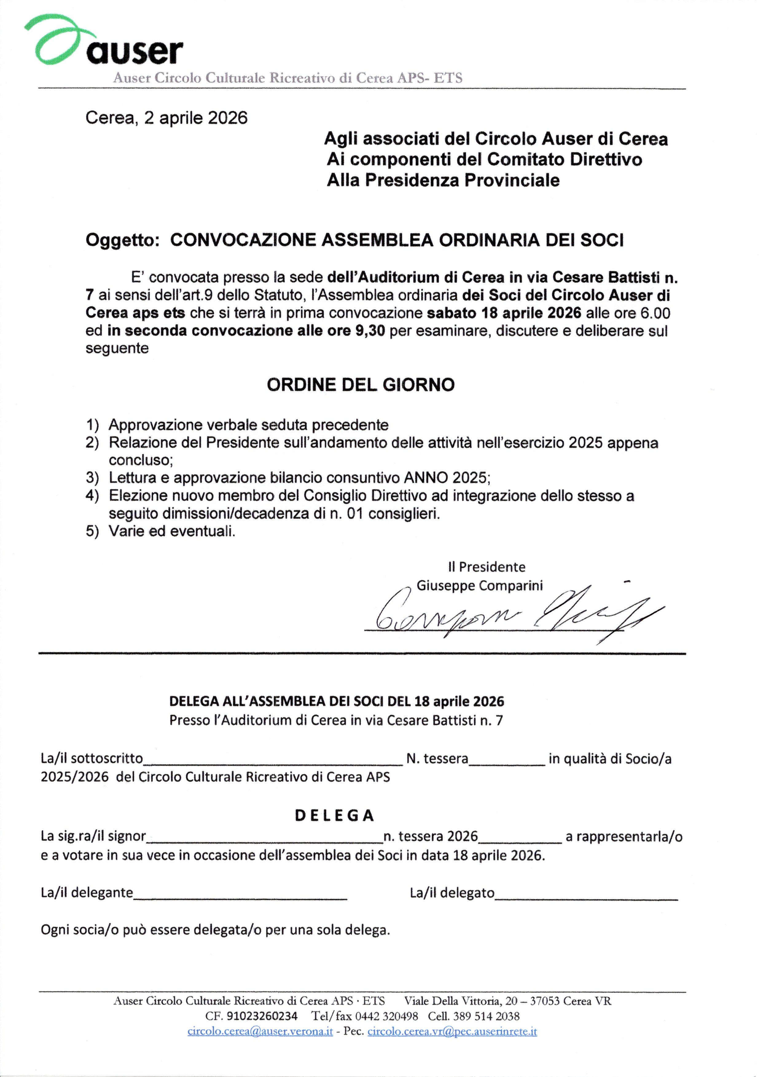 CONVOCAZIONE ASSEMBLEA ORDINARIA DEI SOCI 03 apr 2026, Autore: AUSER CIRCOLO CULTURALE RICREATIVO DI CEREA APS Avviso a tutti i Soci del Circolo AUSER di CEREA CONVOCAZIONE ASSEMBLEA ORDINARIA DEI SOCI Allegati 18-04-2026-Assemblea.jpg Download
