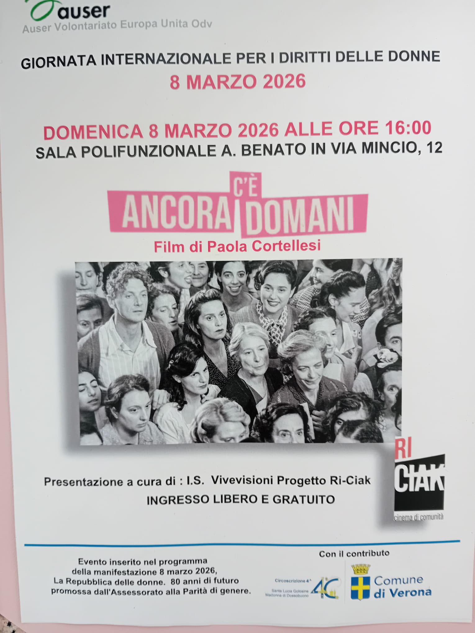 Domenica 8 marzo nella sala polifunzionale A. Benato (via Mincio 12 VR) alle ore 16,00 AUSER VOLONTARIATO EUROPA, in collaborazione con il Comune di Verona e 4^ Circoscrizione, organizza l'evento per festeggiare la "Festa della Donna". Verrà proiettato dall'associazione RI-ciac il film "C'è ancora domani" di Paola Cortellesi. Seguirà un piccolo rinfresco e verrà consegnato un omaggio floreale alle presenti. Il progetto è stato inserito nel programma "Pari Opportunità" del Comune di Verona