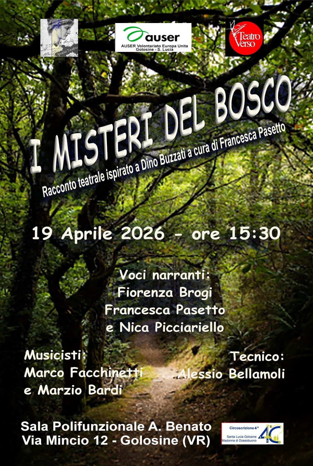 Il 19 aprile 2026 alle ore 15.30 presso la Sala Multifunzionale A. Benato in via Mincio 12 Golosine (VR) sarà rappresentatoa cura di Francesca Pasetto il racconto ispirato a Dino Buzzati "I misteri del Bosco"