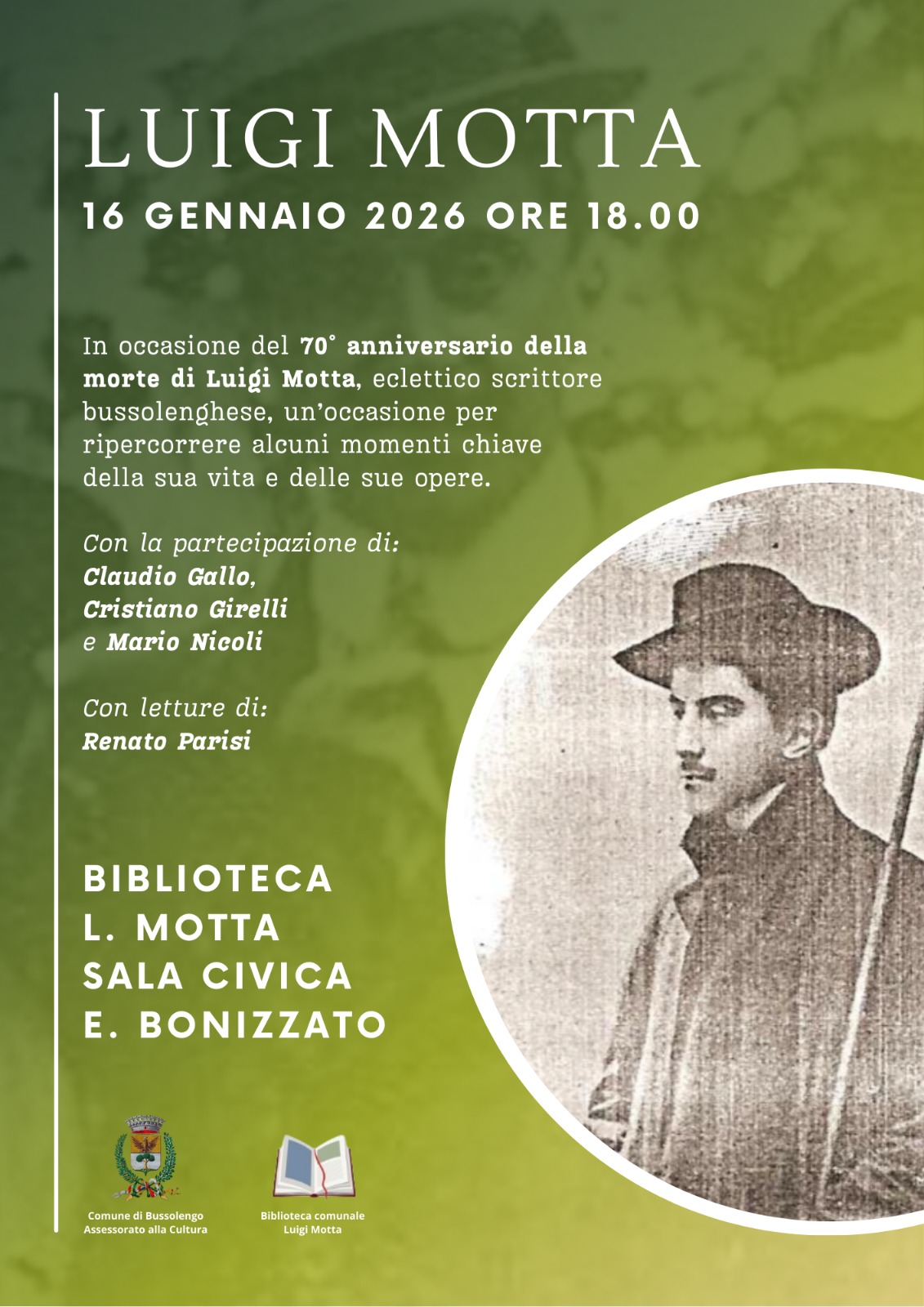 In occasione del 70° anniversario della morte di Luigi Motta, siete invitati Venerdì 16 gennaio 2026 alle ore 18.00 presso la biblioteca a lui intitolata di Bussolengo alla presentazione dello scrittore bussolenghese Luigi Motta ripercorrendo alcuni momenti chiave della sua vita e delle sue opere.