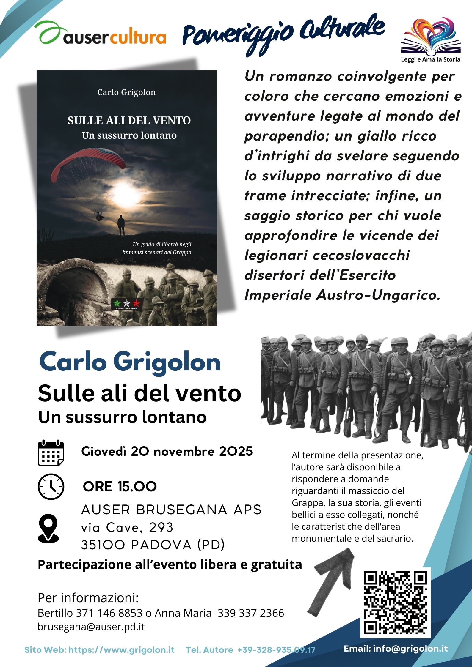 Giovedì 20 novembre 2025 l’autore Carlo Grigolon presenta il libro “Sulle ali del vento. Un sussurro lontano”.