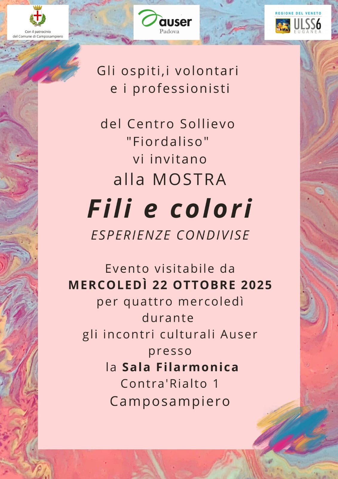 mostra esperienze condivise Centro sollieco Fiordaliso presso sala FILARMONICA CAMPOSAMPIERO A PARTIRE DAL 22 OTTOBRE 25 PER QUATTRO SETIMANE DURANTE GLI INCONTRI CULTURALI