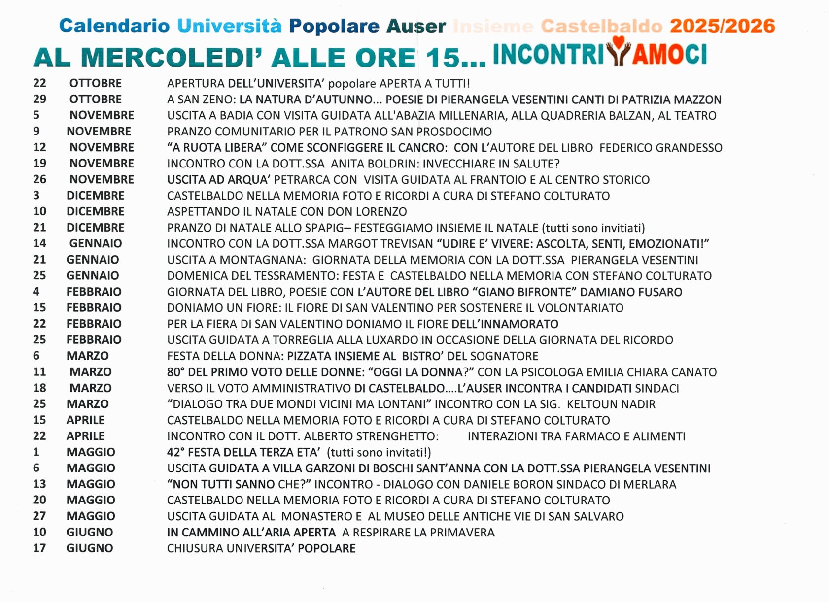Calendario Università Popolare Castelbaldo 2025-2026 01 gen 2026, Autore: AUSER CASTELBALDO "INSIEME" ODV - ONLUS Calendario Auser Castelbaldo 2025/26