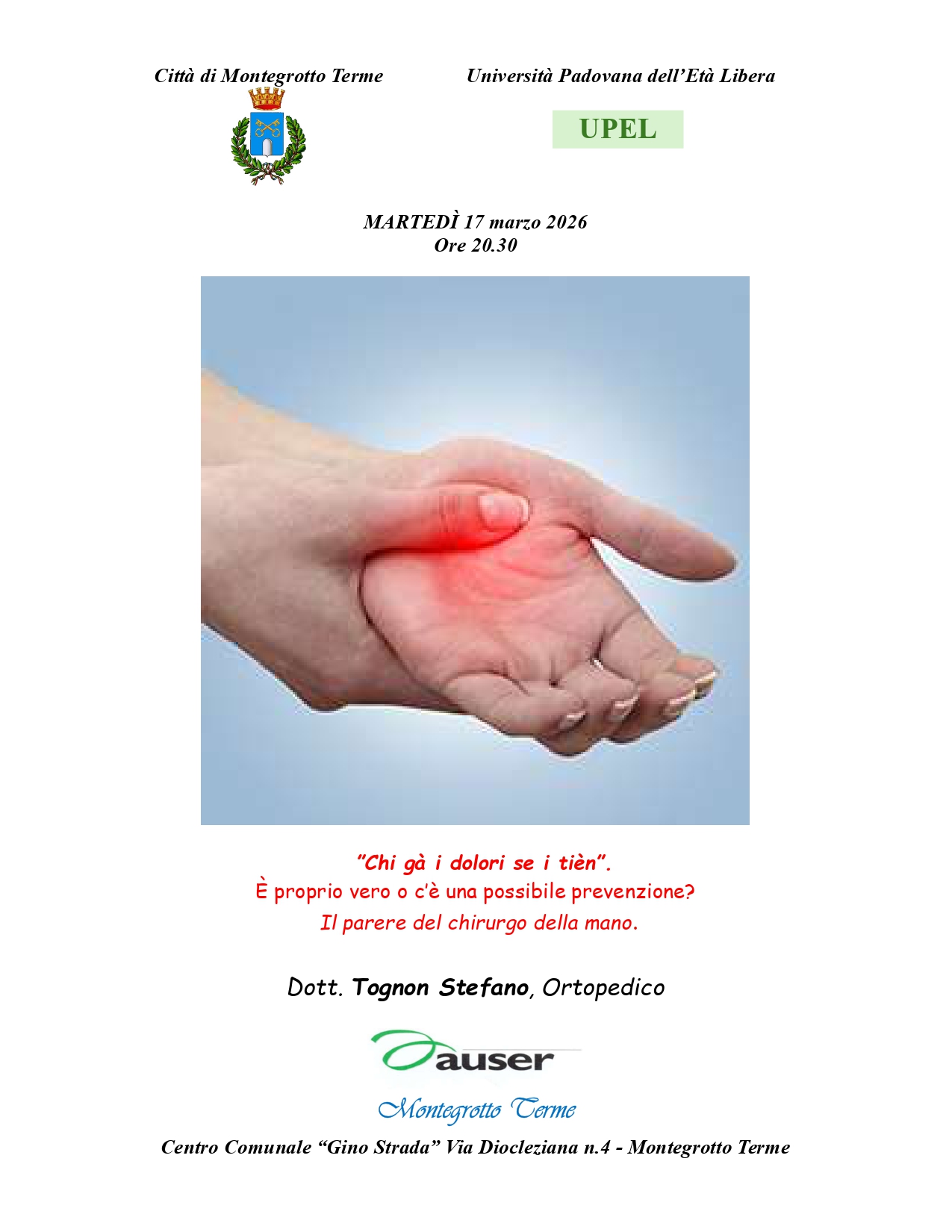 Il prossimo incontro (in orario SERALE) sarà di carattere medico e riguarderà i dolori della mano.