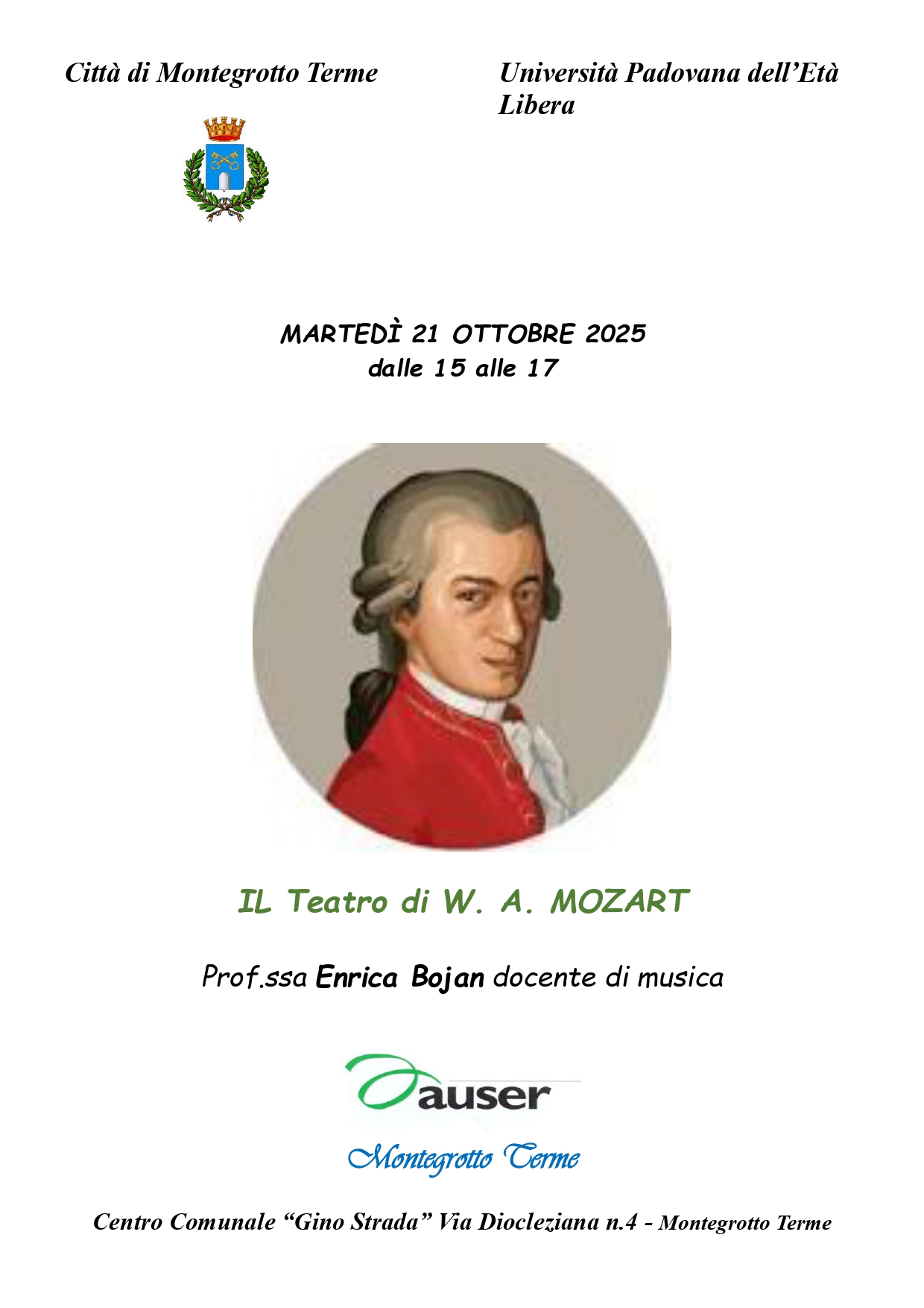 MARTEDÌ 21 OTTOBRE 2025, dalle 15:00 alle 17:00 riprende la stagione delle Conferenze UPEL con un tema particolare: IL TEATRO DI W. A. MOZART. La Conferenza sarà tenuta dalla Prof.ssa Enrica Bojan, eccellente docente di musica. Vi aspettiamo, quindi, numerose/i al nostro Centro Comunale “Gino Strada” Via Diocleziana n.4 - Montegrotto Terme per una ripartenza alla grande!!