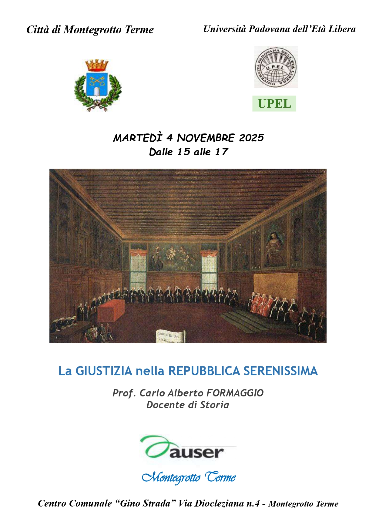 Martedì prossimo, 04/11/2025, dalle 15:00 alle 17:00, continuano le conferenze UPEL con un argomento non comune: LA GIUSTIZIA NELLA REPUBBLICA SERENISSIMA. Il Prof. Carlo Alberto FORMAGGIO, Docente di Storia, ci porterà dentro questo mondo particolare ed interessante. Vi aspettiamo, quindi, alla nostra Sede AUSER “Gino Strada” Via Diocleziana n.4, Motegrotto Terme.