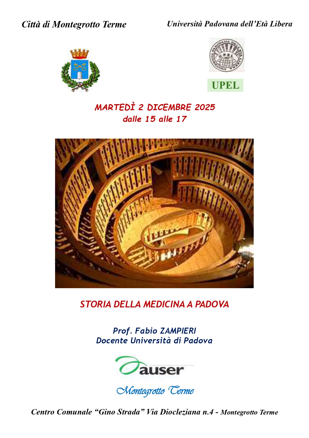 Questa volta il Prof. Fabio ZAMPIERI (Docente dell' Università di Padova) ci porterà nel mondo della Medicina attraverso la Storia, focalizzando l'attenzione all'ambito del nostro territorio padovano.