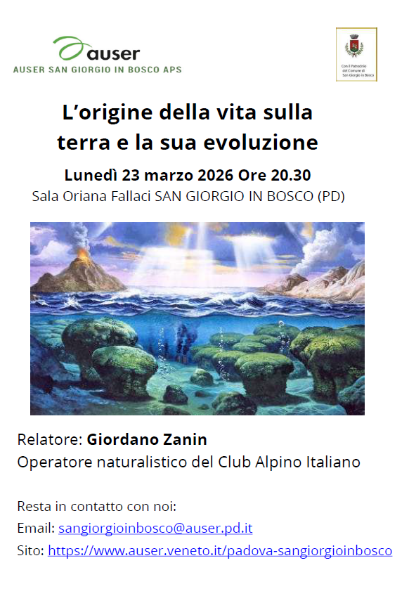 L’origine della vita sulla terra e la sua evoluzione - Lunedì 23 marzo 2026 Ore 20.30 - Sala Oriana Fallaci SAN GIORGIO IN BOSCO (PD)