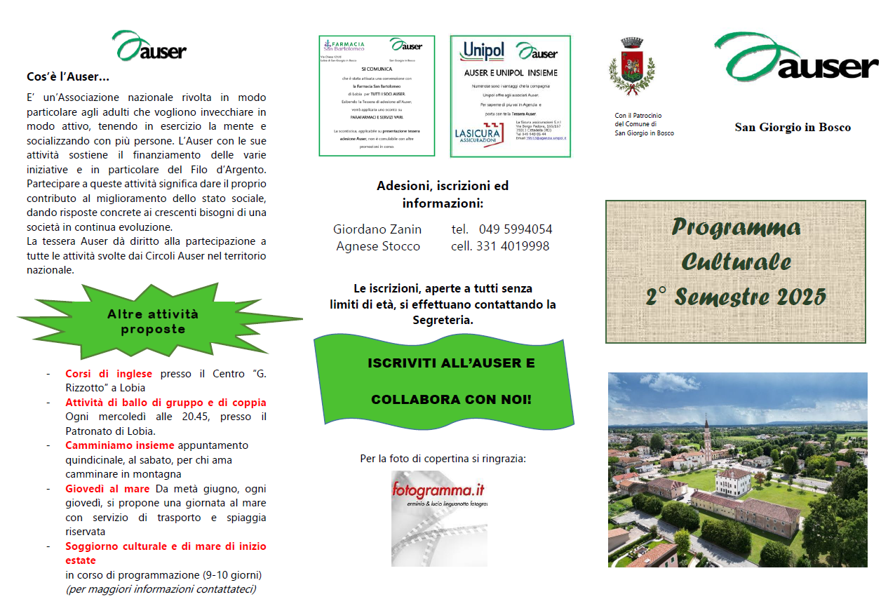 PROGRAMMA CULTURALE AUTUNNO 2025 (CONFERENZE) 13 ott 2025, Autore: AUSER SAN GIORGIO IN BOSCO APS PROGRAMMA CULTURALE AUTUNNO 2025 (CONFERENZE) Allegati 2_SemesteVolantino_lato2.pdf Download 2_semestreLato1Programma.pdf Download