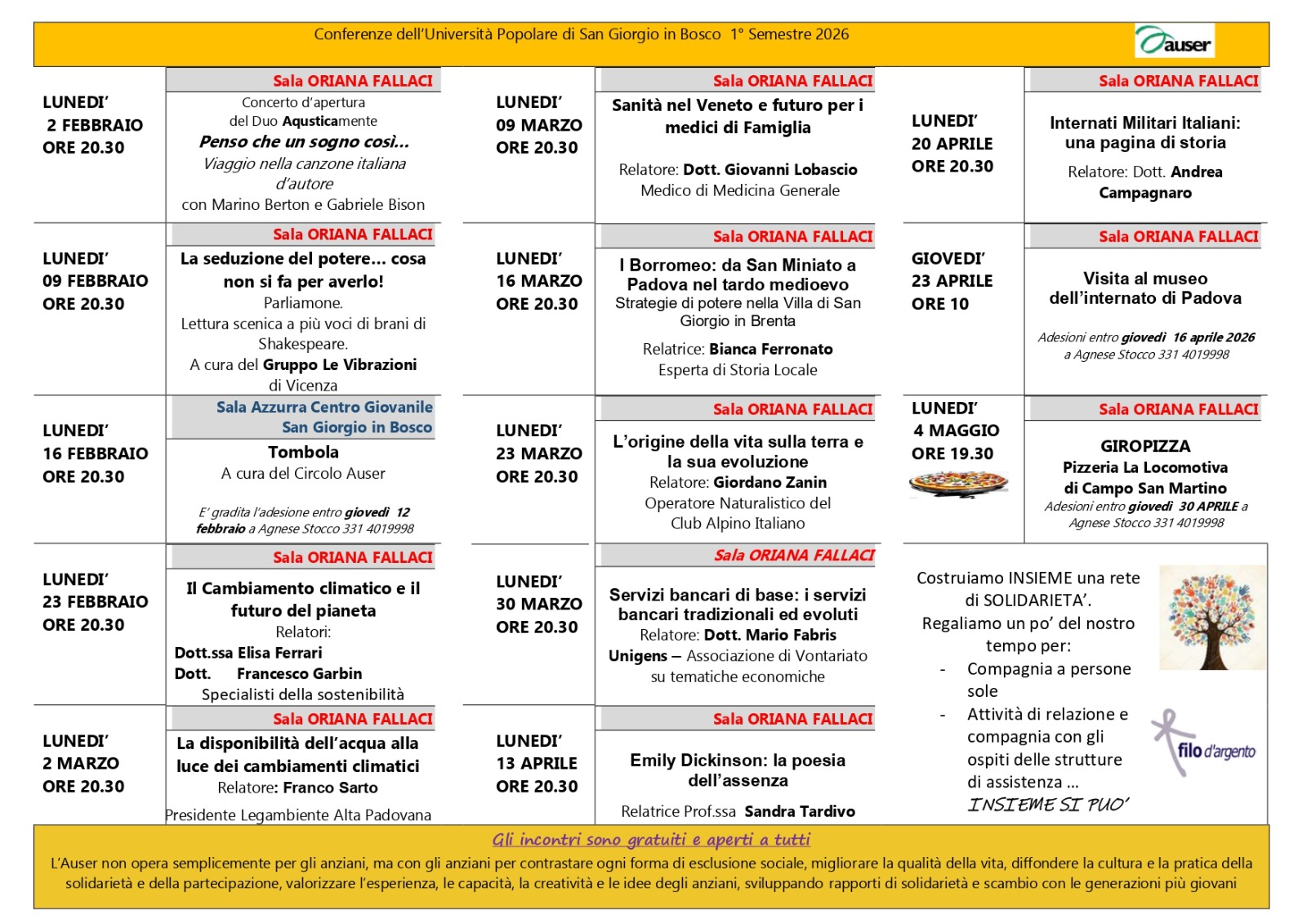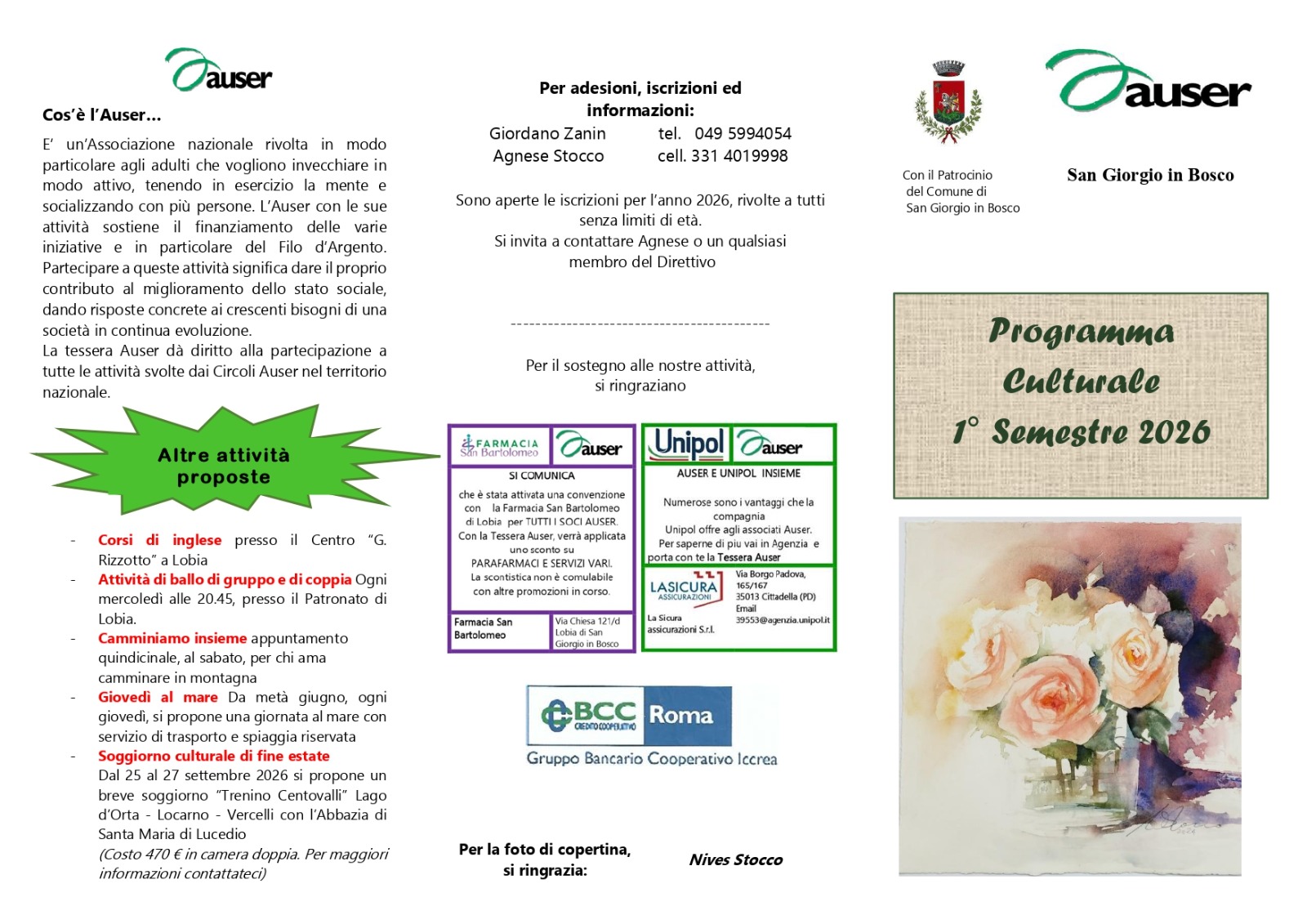 PROGRAMMA CULTURALE PRIMO SEMESTRE 2026 16 gen 2026, Autore: AUSER SAN GIORGIO IN BOSCO APS PROGRAMMA CULTURALE PRIMO SEMESTRE 2026 Allegati LatoA.jpeg Download LatoB.jpeg Download