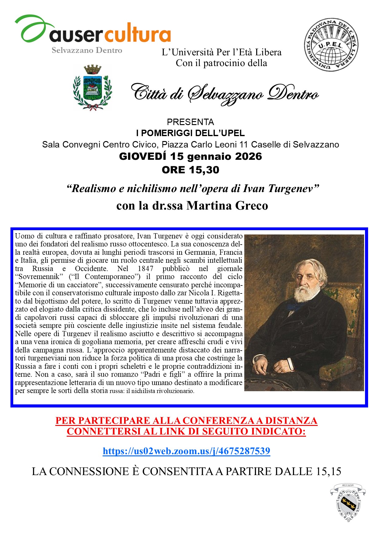 Con la dr.ssa Martina Greco si parlerà ancora di un autore russo: Ivan Turnegev, realismo e nichilismo nella sua opera