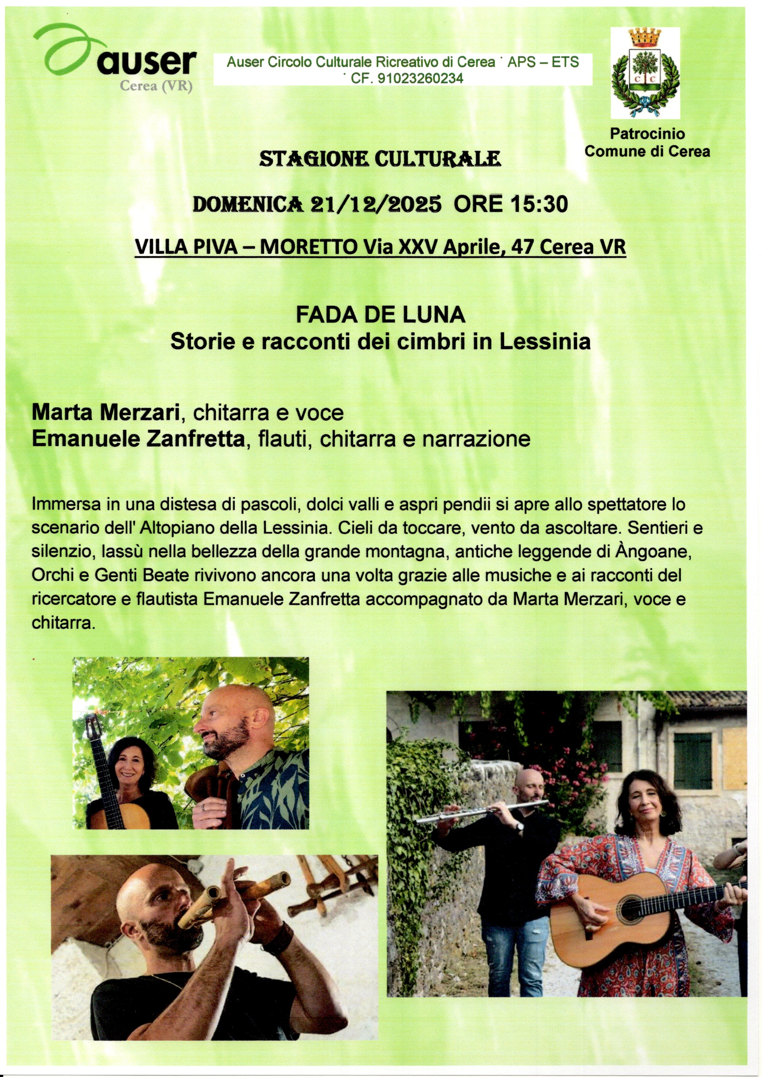 FADA DE LUNA Storie e racconti dei cimbri in Lessinia 14 dic 2025, Autore: AUSER CIRCOLO CULTURALE RICREATIVO DI CEREA APS STAGIONE CULTURALE DOMENICA 21/12/2025 ORE 15:30 VILLA PIVA – MORETTO Via XXV Aprile, 47 Cerea VR FADA DE LUNA Storie e racconti dei cimbri in Lessinia Marta Merzari, chitarra e voce Emanuele Zanfretta, flauti, chitarra e narr ... [Leggi tutto]