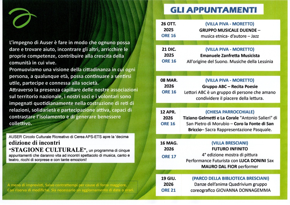IN VIAGGIO TRA TEATRO, MUSICA, ARTE E POESIA PROGRAMMA 2025/2026 20 ott 2025, Autore: AUSER CIRCOLO CULTURALE RICREATIVO DI CEREA APS 10° edizione “STAGIONE CULTURALE IN VIAGGIO TRA TEATRO, MUSICA, ARTE E POESIA PROGRAMMA 2025/2026”